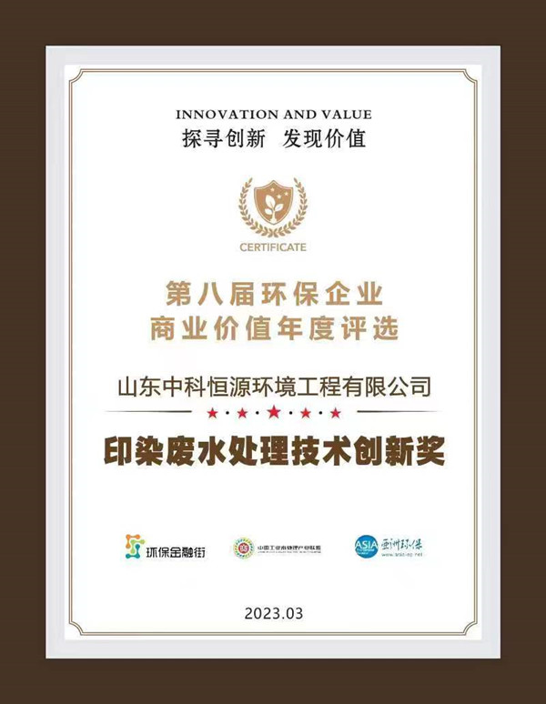 中科恒源荣获第八届环保企业商业价值年度评选——“印染废水处理技术创新奖”